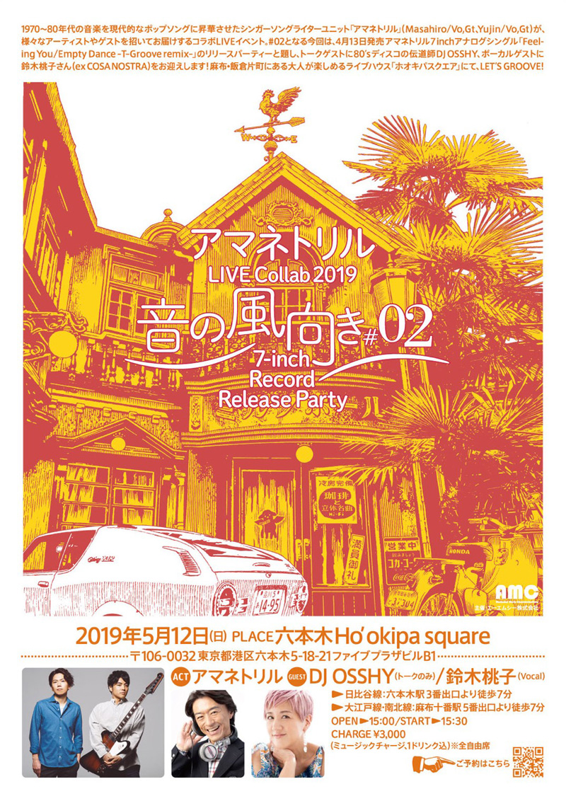 #02となる今回は、4月13日発売 アマネトリル7inch アナログシングル「Feeling You / Empty Dance -T-Groove remix-」のリリースパーティーと題し、トークゲストに80’sディスコの伝道師DJ OSSHY、ボーカルゲストに鈴木桃子さん(ex COSA NOSTRA)をお迎えします!麻布•飯倉片町にある大人が楽しめるライブハウス「ホオキパスクエア」にて、LET’S GROOVE!